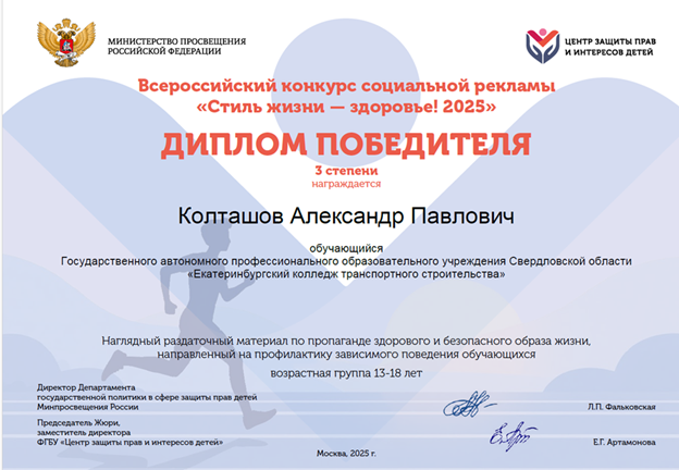 Колташов Александр Павлович с плакатом «Включайся в свою реальность» награжден дипломом победителя 3 степени в номинации «Наглядный раздаточный материал по пропаганде здорового и безопасного образа жизни, профилактике зависимого поведения обучающихся».