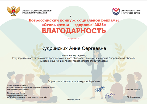 Министерство образования Свердловской области, ГБУ СО «Центр психолого-педагогической, медицинской и социальной помощи «Ладо» поздравляют победителей и благодарят куратора работы - Кудринских Анну Сергеевну, социального педагога ГАПОУ СО «Екатеринбургский колледж транспортного строительства» за качественную подготовку работы.